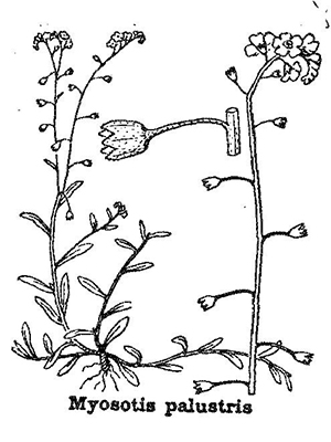 — Plante vivace de 10-60 cm, à poils appliqués ou ceux du bas des tiges étalés; tige rampante ou stolonifère à la base, ascendante, anguleuse, rameuse ; feuilles oblongues ou lancéolées, à poils rudes appliqués ; fleurs bleues, roses ou blanches, assez grandes, en grappes nues à la fin longues et lâches ; pédicelles fructifères étalés, 1-3 fois plus longs que le calice ; calice à poils appliqués, fendu jusqu'au tiers, ouvert à la maturité ; corolle de 6-8 mm, à limbe plan plus long que le tube, à lobes émarginés ; style dépassant le tube du calice. Varie à tige cylindracée (M. repens Don.) ; ou glabrescente à poils appliqués (M. strigulosa Reich.). Lieux marécageux, dans toute la France. — Europe ; Asie occidentale et boréale ; Madère. = Mai-septembre.