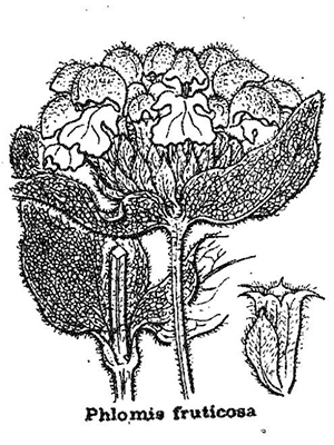 — Sous-arbrisseau de 20-50 cm, tomenteuse-blanchâtre, à tiges terminées par des rameaux simples et dressés ; feuilles assez larges, ovales ou oblongues, entières, blanchâtres-tomenteuses surtout en dessous, fortement nervées-réticulées, les florales conformes et dépassant ordinairement les fleurs ; fleurs jaunes, grandes, 20-30 par verticille, ceux-ci 1-3 au sommet des rameaux et très compacts ; bractéoles ovales-lancéolées, plurinervées, appliquées, tomenteuses et velues, ainsi que le calice tronqué à dents très courtes (1-2 mm), raides et recourbées ; corolle de 2-3 cm, velue-tomenteuse en dehors. Rochers des côtes de Provence : Bouches-du-Rhône, Var. — Europe méditerranéenne surtout orientale ; Asie Mineure. = Mai-juin.