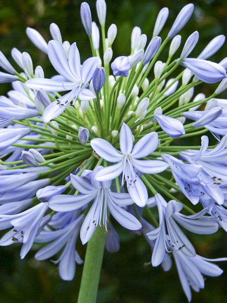 Taille modeste. Ombelles de fleurs bleu lavande clair. Feuilles persistantes en hiver. Très florifère.