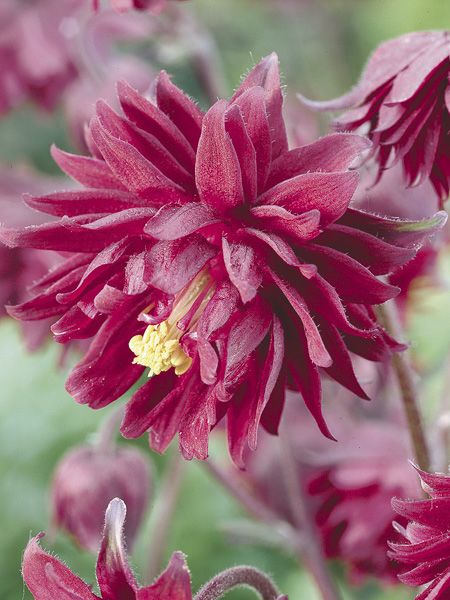 Ancolie de la série Clémentine, aux fleurs érigées, en pompon rose-rouge, sans éperons. Longue floraison du milieu du printemps jusqu'au tout début de l'été.