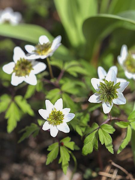 Anémone des bois formant un tapis de feuilles palmées. Fleurs blanches, avec une touffe centrale de "simili-feuilles". Très original. Cette anémone disparait après la floraison et entre en repos pour 9 mois.