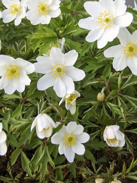 Anémone des bois vigoureuse et bien florifère, formant un tapis de feuilles palmées. Fleurs simples, aplaties, blanches, à étamines jaunes. Cette anémone disparait après la floraison et entre en repos pour 9 mois.