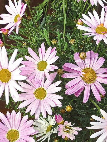 Vivace cultivée en annuelle au nord de la Loire. Elle se couvre de petites marguerites en dégradé de rose tendre à blanc. Feuilles très découpées, vert grisâtre. Très longue floraison, de la fin du printemps à l'automne.