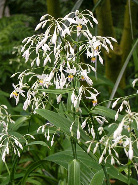 Belle vivace méconnue aux feuilles persistantes lancéolées et panicules graciles de fleurs blanches à base pourprée et étamines duveteuses jaunes.