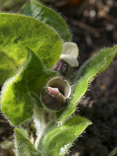 Vivace de sous-bois, à feuilles velues. En dessous des feuilles, toutes petites fleurs à 3 pétales, blanches à base pourpre.