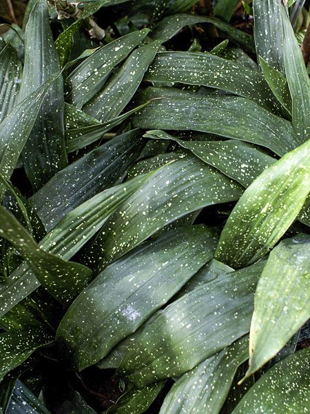 Variété d'aspidistre aux feuilles lancéolées, plus étroites, vertes ponctué de blanc. Vous pouvez aussi l'installer en pot ou bac en extérieur, à l'ombre, et la rentrer l'hiver, si la température descend en dessous de -7°C.