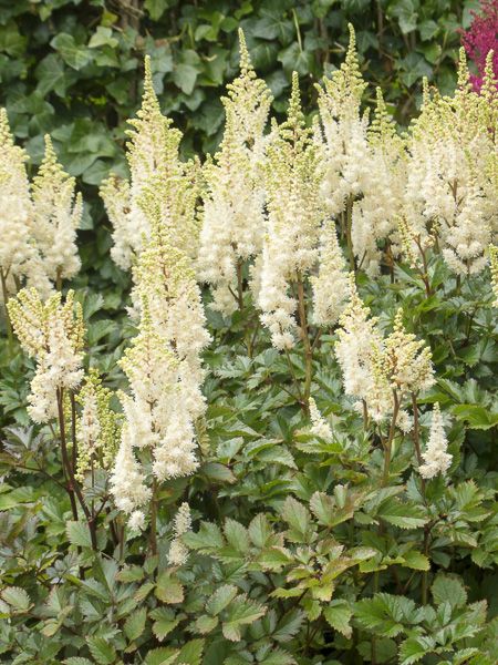 Astilbe hybride à floraison estivale en panicules denses de fleurs crème, à pointes vertes. Feuilles vert foncé, virant au bronze.