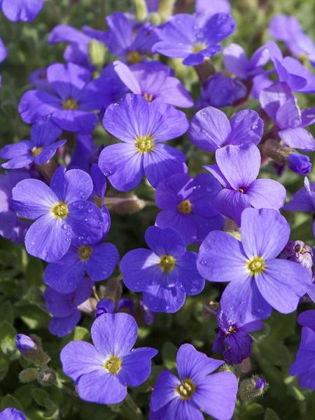 Très florifère, cette aubriète forme un tapis de fleurs bleu mauve au printemps. Facile de culture.