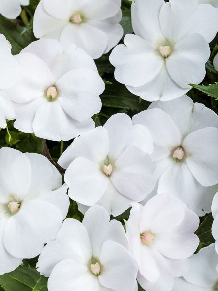 Impatience de Nouvelle-Guinée, formant un coussin de feuilles vert foncé recouvert de fleurs blanches, de la fin du printemps jusqu'à l'automne. Vigoureux et résistant aux maladies. Résiste bien au soleil.