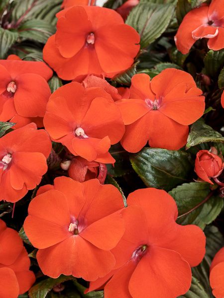 Impatience de Nouvelle-Guinée, formant un coussin de feuilles vert foncé recouvert de fleurs orange écarlate, de la fin du printemps jusqu'à l'automne. Vigoureux et résistant aux maladies. Résiste bien au soleil.