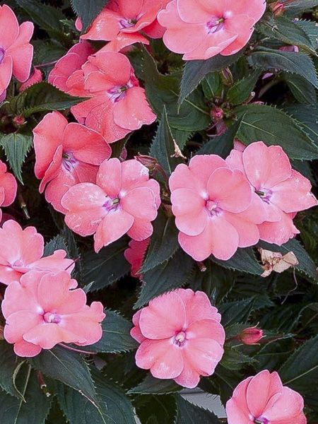Impatience de Nouvelle-Guinée, formant un coussin de feuilles vert foncé recouvert de fleurs rose dragée, de la fin du printemps jusqu'à l'automne. Vigoureux et résistant aux maladies. Résiste bien au soleil.