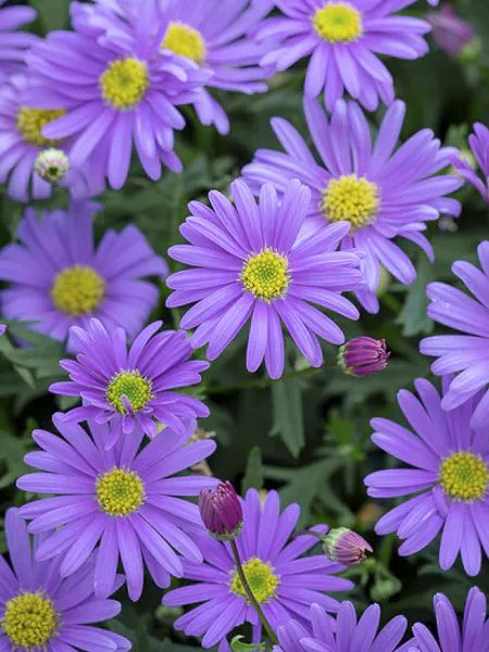 Vivace cultivée en annuelle formant une touffe. Petites mais nombreuses fleurs de marguerite lilas violacé, à disque jaune.