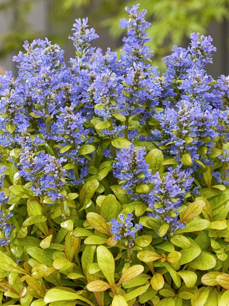 Ce bon couvre-sol, au port compact, aux feuilles chartreuses à dorées, veiné de bronze orangé produit des épis de fleurs bleu cobalt au printemps. Intéressante pour illuminer un coin sombre du jardin.