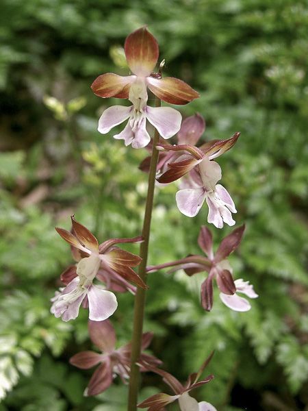 Orchidée terrestre, produisant des hampes florales de fleurs aux tépales verte à brun pourpré et labelle mauve pâle. Ses longues feuilles sont plissées et forment de belles touffes, persistantes si lors des hivers doux, sinon caduques.