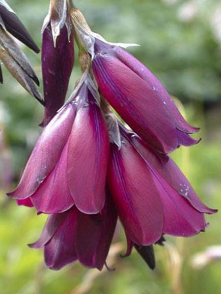 Vivace aux feuillage de graminée. Longues tiges souples portant des épis de fleurs en clochette pendante rose pourpré, à partir de boutons violets. Rustique jusqu'à -10°C en sol bien drainé.