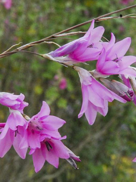 Ces vivaces à cormes aimant les sols frais, les expositions ensoleillées et la chaleur, ressemblent beaucoup à des crocosmias avec leur feuillage linéaire et leurs fleurs pendantes disposées le long de tiges souplement arquées.