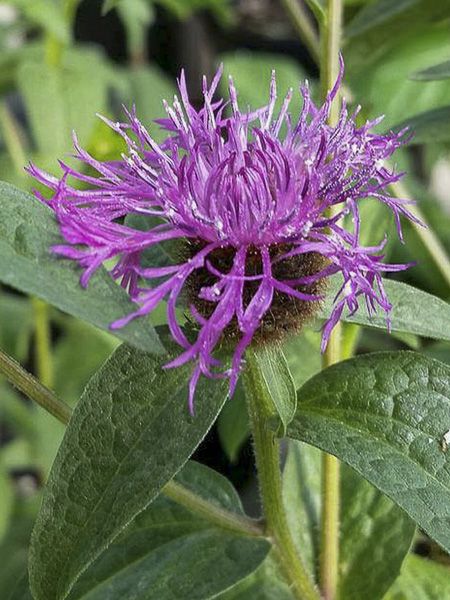 — Plante vivace à souche épaisse, stolonifère ; plante pubescente aranéeuse de 2-4 dm, dressée, presque toujours simple et monocéphale ; feuilles sessiles, longuement décurrentes de l'une à l'autre, larges, lancéolées ou lancéolées-oblongues, entières ; involucre gros, ovoïde, à folioles entourées d'une large bordure noire à cils noirs égalant à peu près la largeur de la bordure ou plus courts ; akènes gros {6 mm de longueur environ), à aigrette blanchâtre égalant le 1/5 environ de leur longueur, à ombilic barbu ; fleurs bleues, les extérieures rayonnantes. Rochers, prés, bois des montagnes : Vosges, Jura, Bugey, Bourgogne, Savoie, Dauphiné, Provence, Alpes-Maritimes, Plateau central, Cévennes, Pyrénées-Orientales. — Europe centrale, Italie. = Mai-juillet.