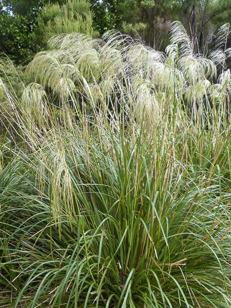 Graminée vivace formant une touffe compacte. Feuilles de 1-1,2 m de long, raides, arquées, linéaires, vert moyen, teintées de rouge-brun, souvent frangées de poils fins à la base. Hampes dressées ou arquées portant des panicules pendantes de 30-45 cm de long, constituées d'épillets de 3-7 fleurs crème, de 1-2 cm de long.
