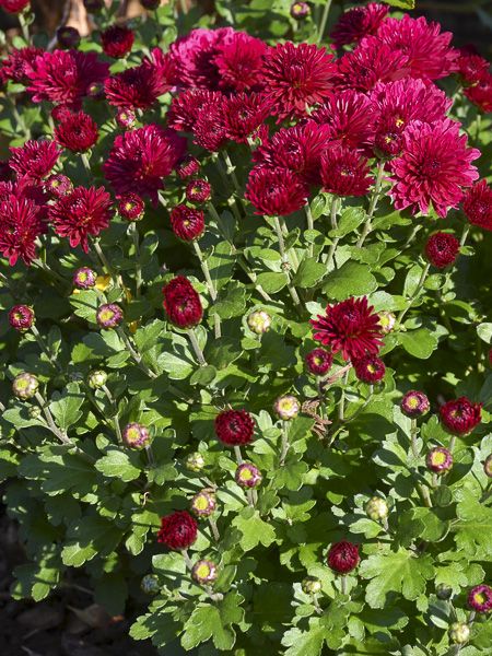 Chrysanthème d'automne, compact, aux nombreux capitules très doubles, rouge pourpré sombre. Facile à vivre et très rustique.