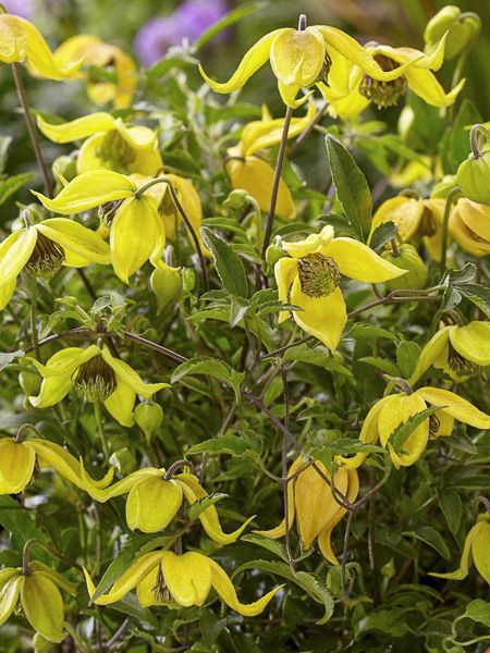 Clématite hybride de tangutica, naine et compacte, à peine grimpante. Fleurs simples, campanulées, jaune. Longue floraison.