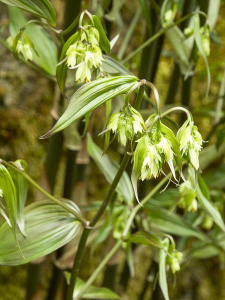 Vivace de sous-bois aux feuilles vertes, brillantes. Hampes de fleurs tubulaires blanc verdâtre, pendantes, suivies de fruits rouge en automne. Rusticité -12°C.