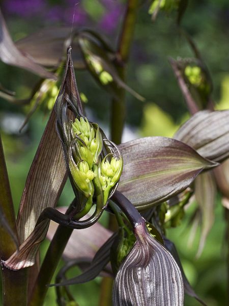 Jeunes pousses brun-violacé, très sombre. Hampes de fleurs tubulaires vert chartreuse. Rusticité -12°C.