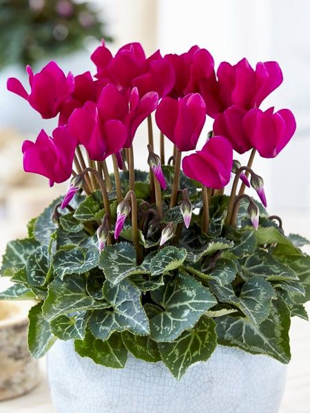 Vivace tubéreuse. Feuilles cordiformes, 3-4 cm de long, vert foncé, souvent marbré d'argent dessus, vert pâle ou pourpré au revers. Fleurs odorantes, de 1-4 cm de long, roses, rouges ou blanches, apparaissant en même temps que les feuilles.