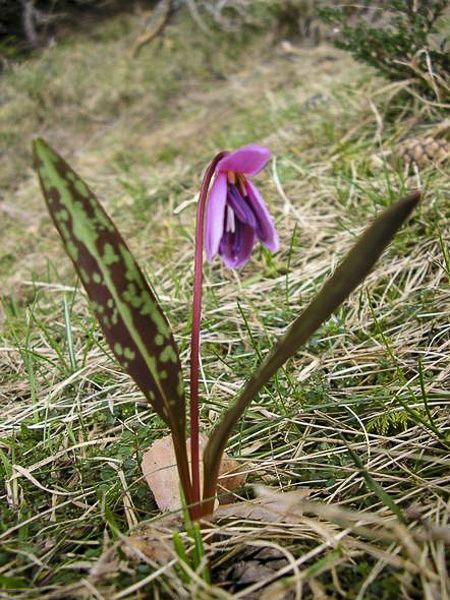 — Plante vivace de 10-30 cm, glabre, à bulbe tunique, blanc, oblong, en forme de dent canine ; feuilles 2, opposées au-dessus de la base de la tige, elliptiques-lancéolées, étalées, les primordiales ovales en coeur, toutes pétiolées, glauques, fortement tachées de brun rougeâtre ; fleur grande, rose tachée de blanc et de jaune à la base, solitaire, penchée ; périanthe marcescent, à 6 divisions libres, lancéolées, conniventes à la base, puis réfractées en arrière, les 3 intérieures ayant à la base 2 callosités ; 6 étamines, plus courtes que le périanthe, à filets en fuseau ; anthères bleues, dressées, fixées par la base creuse ; style filiforme, à stigmate trifide ; capsule réfléchie, subglobuleuse-trigone ; graines ovoïdes, renflées, arillées. Bois et prairies des montagnes : Alpes ; Cévennes et tout le Plateau central jusqu'au Limousin ; Corbières et Pyrénées, jusque dans les Landes. — Europe centrale et méridionale ; Caucase, Sibérie, Japon, = Mars-mai.