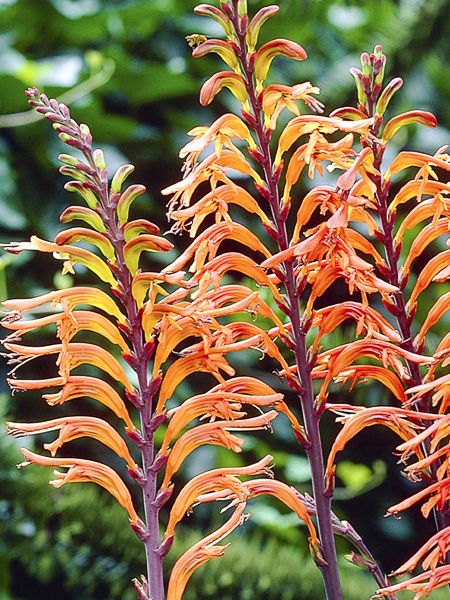 Épis de fleurs tubulaires jaune, orange et rouge vif, disposées sur 2 rangs, au somment des tiges pourpres.