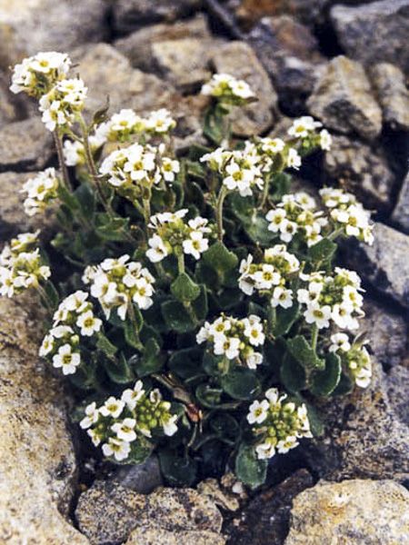 Vivace alpine, en coussin, à feuilles en rosette produisant de petites fleurs blanches.