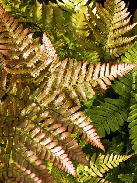 Sélection plus trapue et plus élégante de cette fougère à frondes largement triangulaires, rose cuivré quand elles sont jeunes, puis virant au vert foncé, divisées en pinnules dentées se maintenant jusqu'au milieu de l'hiver.
