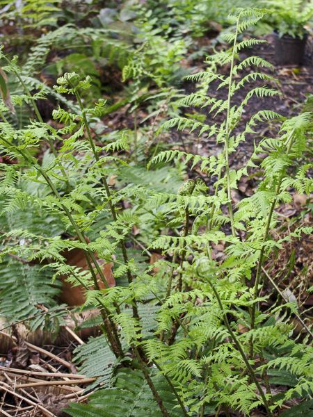 Fougère semi-persistante, formant une grande touffe de frondes triangulaires, bipennées, vert clair. Déroulement précoce des crosses.