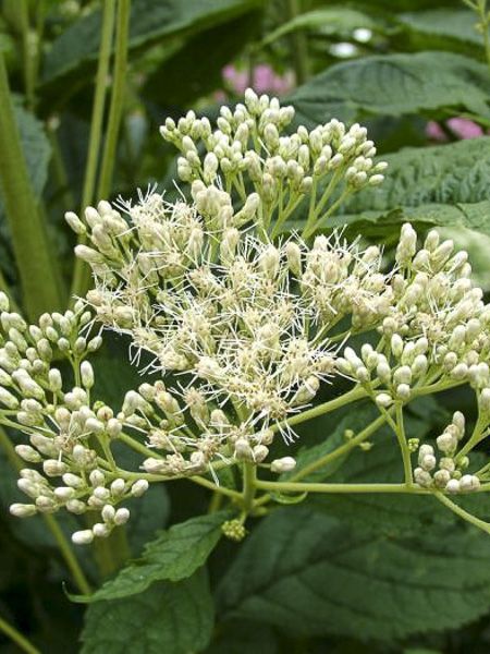 Grande eupatoire aux tiges dressées portant tout le long des feuilles lancéolées, bien arrangées. Au sommet, inflorescences de petites fleurs plumeuses blanc pur.