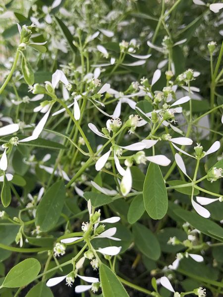 Nuage de petites fleurs blanches, à fins pétales, pendant une longue période.
