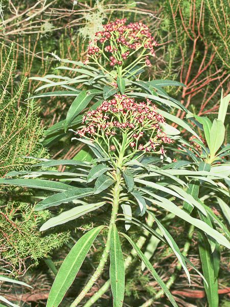 Arbuste arrondi, à fortes pousses et feuilles oblongues à lancéolé étroit, vert sombre, 20 cm. Cymes terminales de cyanthia sentant le miel, 8-10 cm, suivis de fruits ressemblant à des pois.