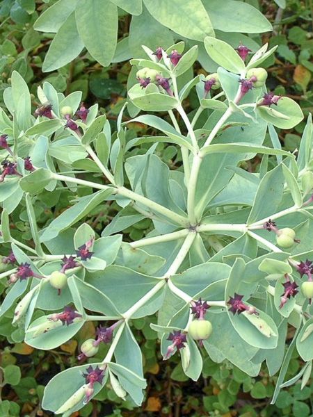 Vivace herbacée, rhizomateuse, ramifiée. Tiges dressées, rougeâtres. Feuilles alternes, bleu-vert. Grappes terminales de fleur entourée de petites coupes rouge sombre à glandes violettes. Séve laiteuse et irritante.