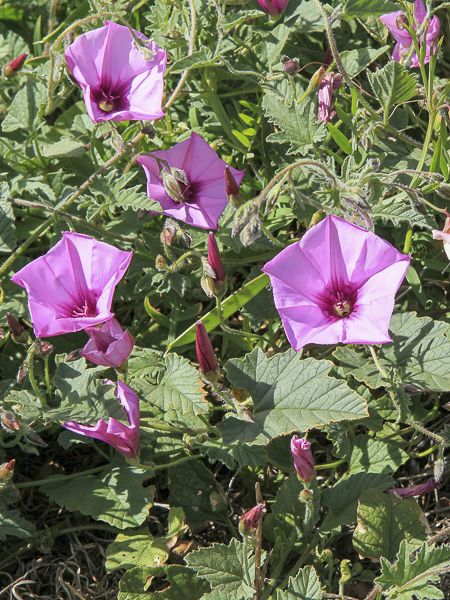 Liseron rampant ou grimpant. Feuilles découpées, velues, vertes. Fleurs en entonnoir rose pâle à gorge plus foncé.