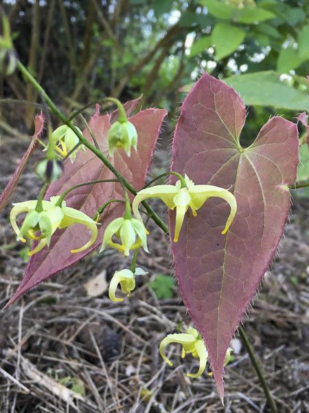 Epimedium très vigoureux à la généreuse floraison de grandes fleurs jaune citron, vertes en bouton. Feuilles fortement teinté de bronze rouge au printemps.