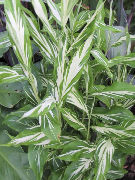 Une forme rare de gingembre japonais aux longues feuilles panachées de blanc. Fleurs jaune pâle à la base des tiges, faisant penser à celles des orchidées. Les rhizomes, jeunes pousses et boutons sont comestibles. Très ornemental. Rustique jusqu'à -12°C à condition de protéger la souche en hiver.