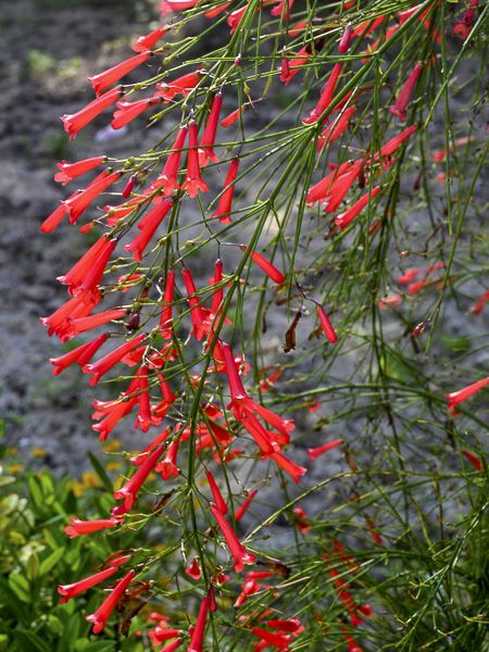Sous-arbrisseau vivace à souche ligneuse, au port pleureur. Pendant une très longue période, il produit de nombreuses fleurs tubulaires écarlates. Ne supportant pas le gel, vous pouvez le cultiver en suspension.