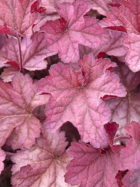 Feuilles d'abord rose pourpré, virant au rouge caramel. Hampes de fleurs corail.