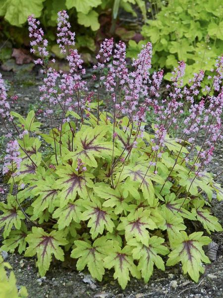 Heucherella aux feuilles vert chartreuse maculé lie-de-vin en étoile. Belle floraison rose tendre.