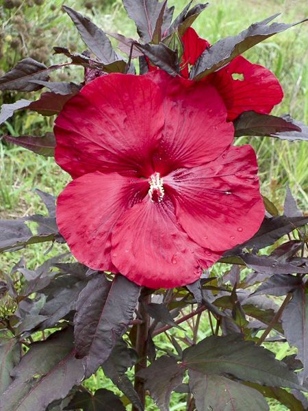 Fleurs de 25 cm de diamètre en coupe plate, rouge intense. Feuilles pourpre sombre.