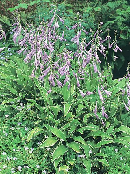 Le feuillage des hostas est unique, avec leurs formes en coeur de quelques cm à 40 cm d'envergure selon les cultivars. Elles peuvent être brillantes, ondulées ou veinées. Leurs couleurs varient du vert intense au bleu glauque, sans oublier les variétés panachées de jaune ou de blanc. Leurs panicules de fleurs sont bien au-dessus du feuillage dans les tons blanc, lavande ou bleu. Un genre incontournable dans tous les massifs frais de mi-ombre. Les cultivars non panachés de blanc ou de jaune supportent bien le soleil, à condition que la terre reste bien humide. Les hostas se plaisent bien en pot également. En les associant avec quelques bulbes à floraison hivernale tels les perce neige , les cyclamen, la potée garde un intérêt tout au long de l'année. Les escargots et limaces en raffolent au printemps, mais ils ont tendance à délaisser les cultivars aux feuilles épaisses. À savoir : selon les cultivars, les couleurs des feuilles ont tendance à évoluer en cours de saison. Le jaune devient crème ou vert et le bleu verdit, parfois l'inverse. Les Hosta se plaisent en bordure de bassin, en situation mi-ombragée. Associées à des fougères et des astilbes, elles forment des tableaux charmants.