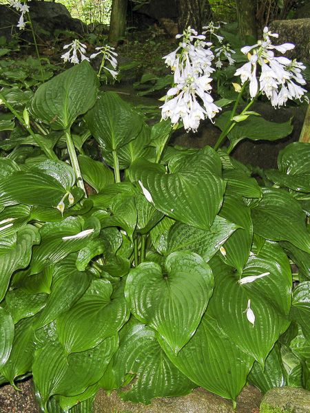 Le feuillage des hostas est unique, avec leurs formes en coeur de quelques cm à 40 cm d'envergure selon les cultivars. Elles peuvent être brillantes, ondulées ou veinées. Leurs couleurs varient du vert intense au bleu glauque, sans oublier les variétés panachées de jaune ou de blanc. Leurs panicules de fleurs sont bien au-dessus du feuillage dans les tons blanc, lavande ou bleu. Un genre incontournable dans tous les massifs frais de mi-ombre. Les cultivars non panachés de blanc ou de jaune supportent bien le soleil, à condition que la terre reste bien humide. Les hostas se plaisent bien en pot également. En les associant avec quelques bulbes à floraison hivernale tels les perce neige , les cyclamen, la potée garde un intérêt tout au long de l'année. Les escargots et limaces en raffolent au printemps, mais ils ont tendance à délaisser les cultivars aux feuilles épaisses. À savoir : selon les cultivars, les couleurs des feuilles ont tendance à évoluer en cours de saison. Le jaune devient crème ou vert et le bleu verdit, parfois l'inverse. Les Hosta se plaisent en bordure de bassin, en situation mi-ombragée. Associées à des fougères et des astilbes, elles forment des tableaux charmants.