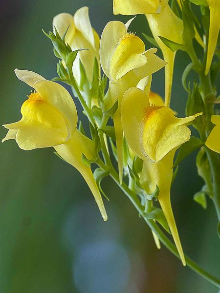 Vivace érigée au feuilles embrassantes, glauque. Grappes légères de petites fleurs jaunes, avec une tache orange, munies d'un éperon.