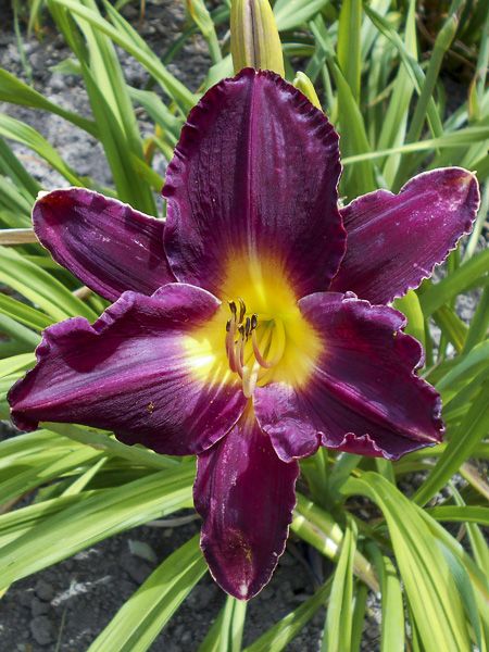 Fleur de 12 cm de diamètre, prune sombre, à gorge très contrasté, jaune-vert citron. Une des hémérocalles les plus sombres.