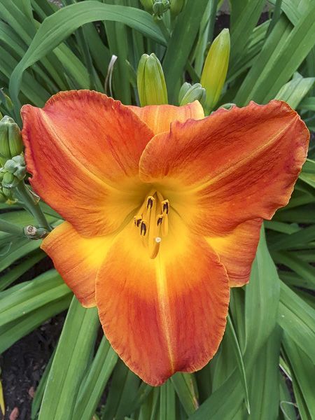 Hémérocalle aux fleurs de 12 cm de diamètre, rouge cerise à cœur jaune orangé.