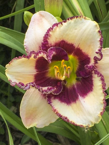 Hémérocalle aux fleurs de 12 cm de diamètre, crème abricot à œil prune, frisé prune en bordure et œil vert.