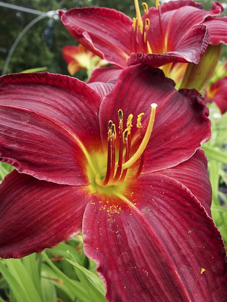 Hémérocalle aux fleurs de 12 cm de diamètre, rouge pourpré à cœur jaune chartreux.
